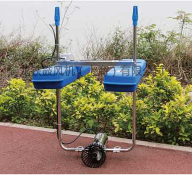 推流曝气机是由专用高速电动机、吸气室、进气管、叶轮等部件组成。高性能电 动机带动叶轮高速旋转,使吸气室产生真空低压区,空气在大气压力的作用下,经进气 管吸入的压缩空气与水体充分混合,然后通过叶轮高速旋转产生强大的轴向推动力和径向 搅拌力,将吸入的空气搅碎成很细小的气泡,并向水平方向推射入水体。对水体冲击、搅 拌、推动水流,加速气泡扩散混合到水体中,使空气中的氧充分被溶解和吸收,提高了 氧转移效率,达到曝气充氧的目的。
